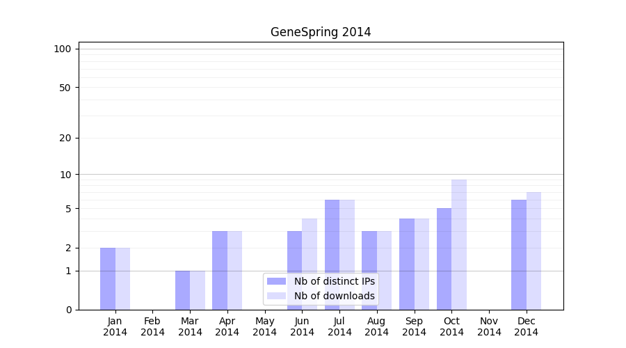Number of downloads for software package GeneSpring, year by year, from 2025 back to 2014 (years with no downloads are omitted):