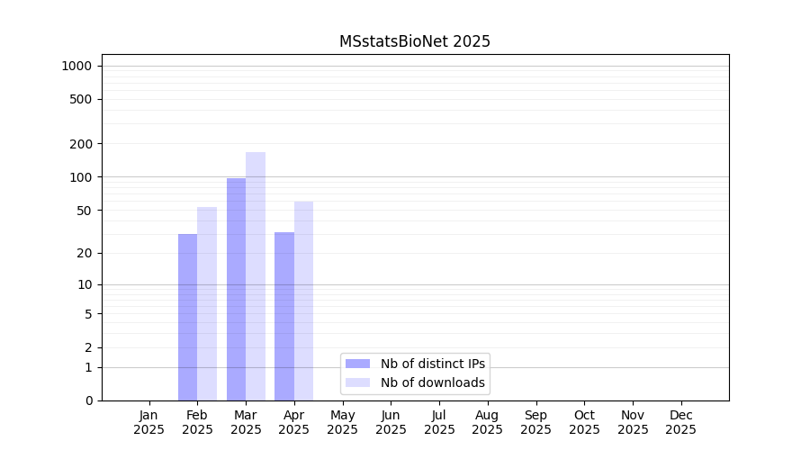 Number of downloads for software package MSstatsBioNet, year by year, from 2025 back to 2014 (years with no downloads are omitted):