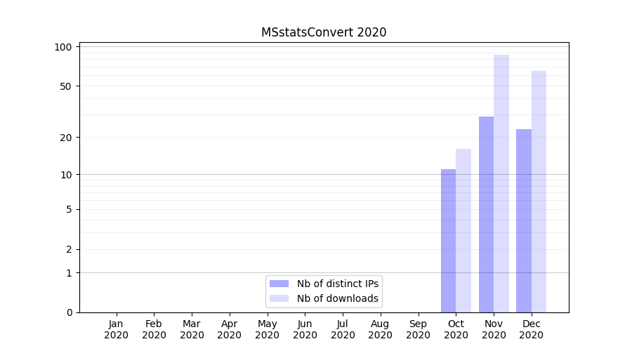 Number of downloads for software package MSstatsConvert, year by year, from 2025 back to 2014 (years with no downloads are omitted):