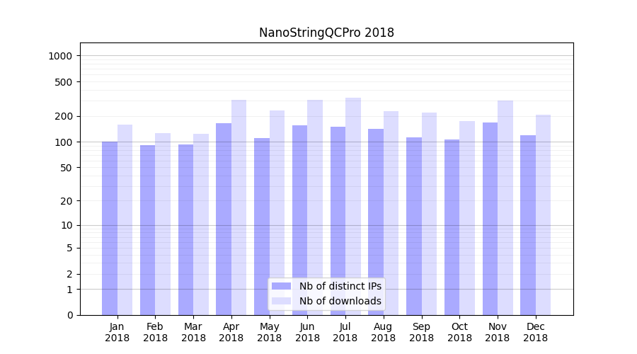 Number of downloads for software package NanoStringQCPro, year by year, from 2025 back to 2014 (years with no downloads are omitted):