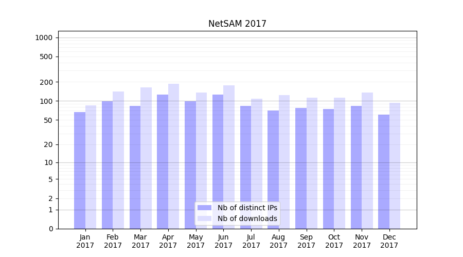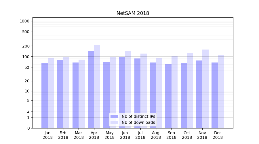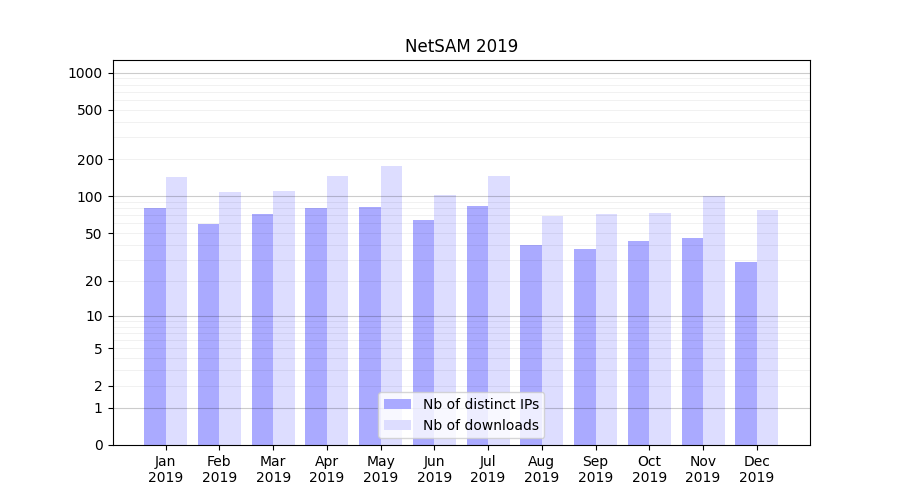 Number of downloads for software package NetSAM, year by year, from 2025 back to 2014 (years with no downloads are omitted):