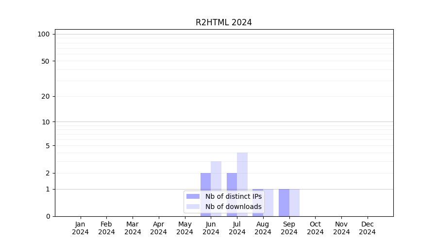 Number of downloads for software package R2HTML, year by year, from 2025 back to 2014 (years with no downloads are omitted):