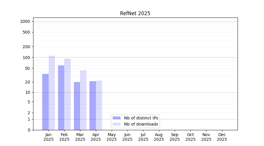 Number of downloads for software package RefNet, year by year, from 2025 back to 2014 (years with no downloads are omitted):