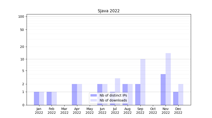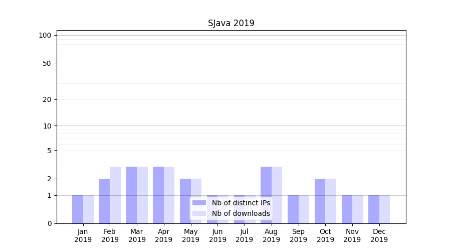 Number of downloads for software package SJava, year by year, from 2025 back to 2014 (years with no downloads are omitted):