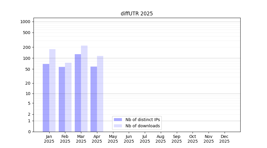 Number of downloads for software package diffUTR, year by year, from 2025 back to 2014 (years with no downloads are omitted):