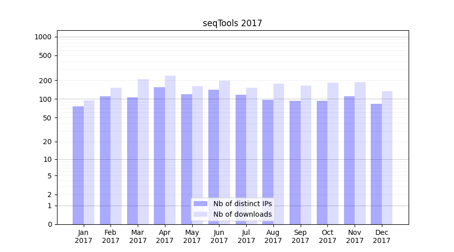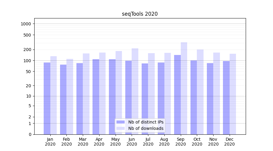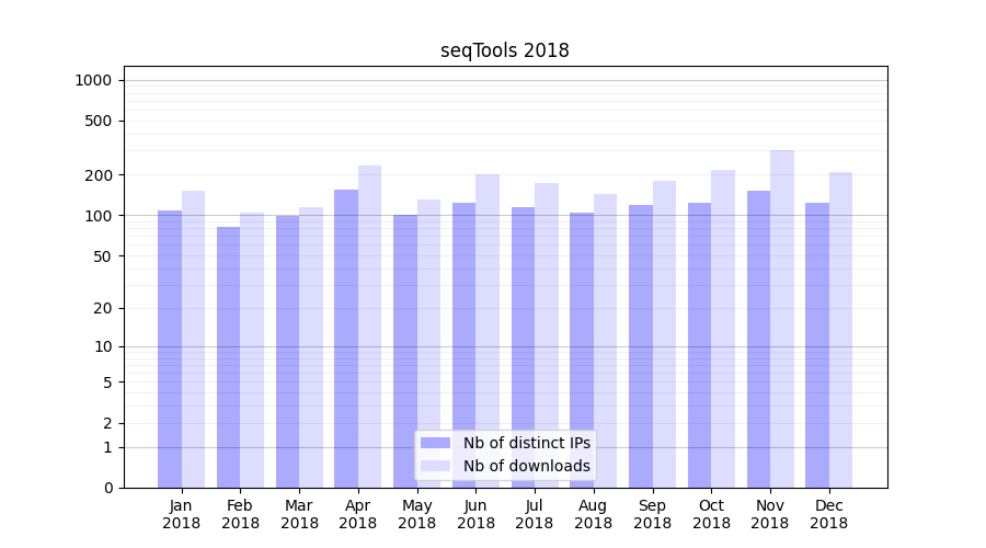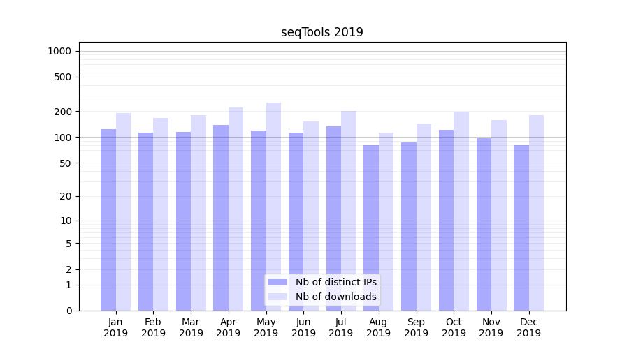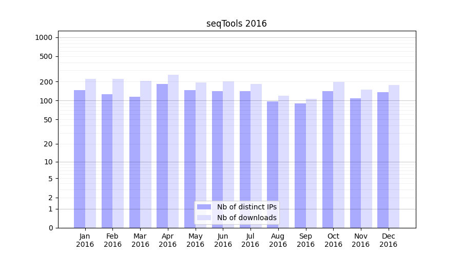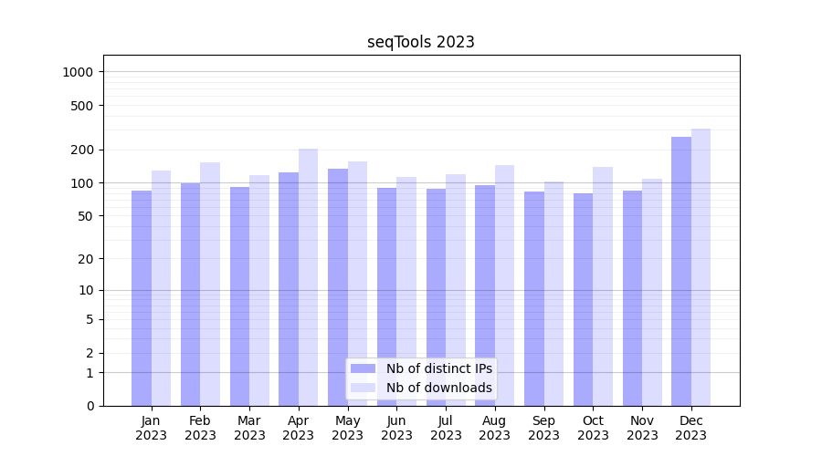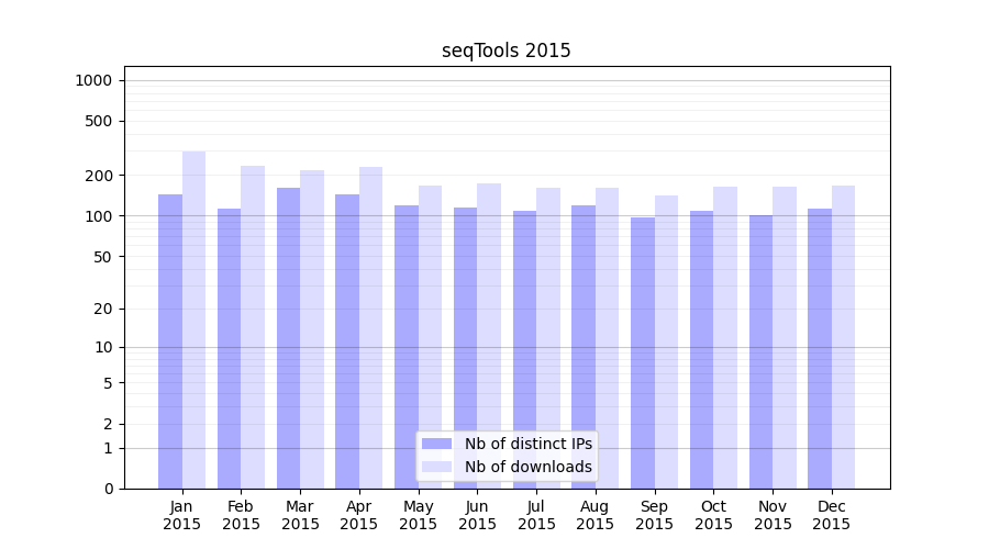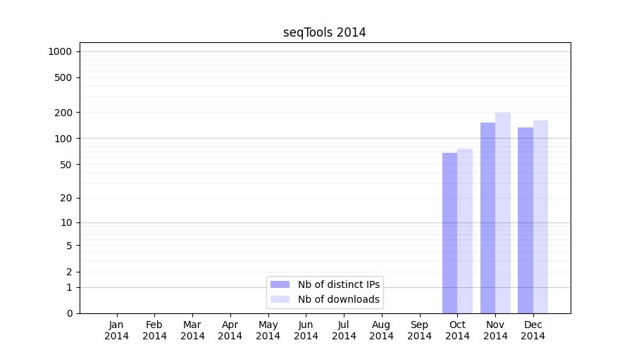 Number of downloads for software package seqTools, year by year, from 2025 back to 2014 (years with no downloads are omitted):