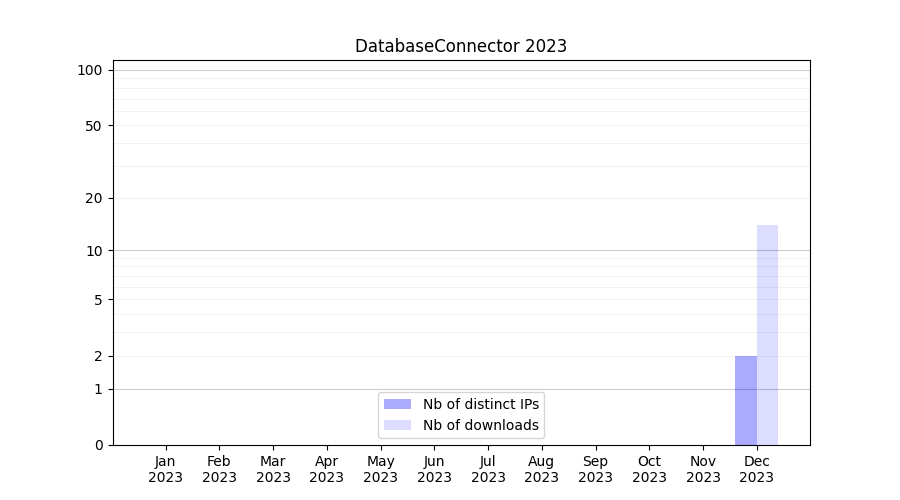 Number of downloads for annotation package DatabaseConnector, year by year, from 2025 back to 2014 (years with no downloads are omitted):