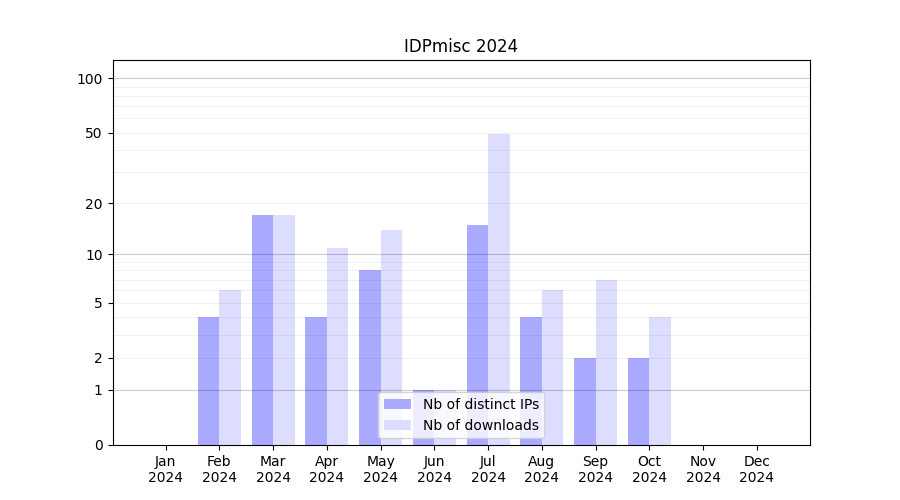 Number of downloads for annotation package IDPmisc, year by year, from 2025 back to 2014 (years with no downloads are omitted):