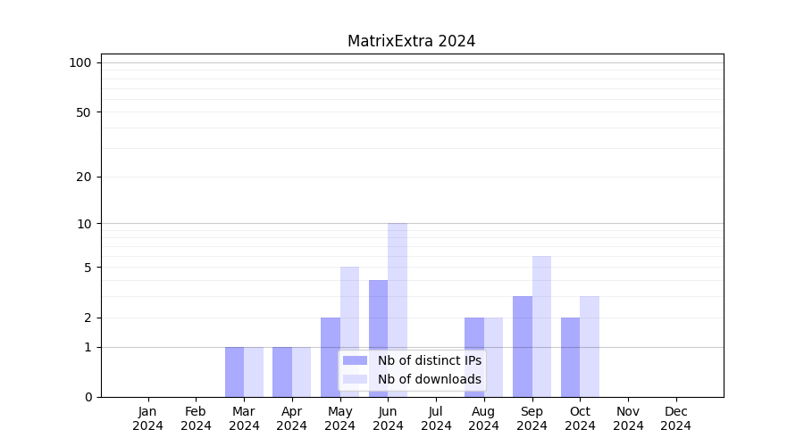 Number of downloads for annotation package MatrixExtra, year by year, from 2025 back to 2014 (years with no downloads are omitted):