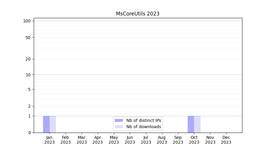 Number of downloads for annotation package MsCoreUtils, year by year, from 2025 back to 2014 (years with no downloads are omitted):