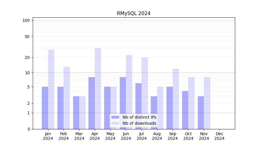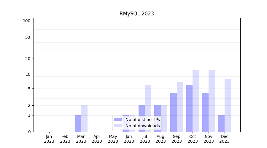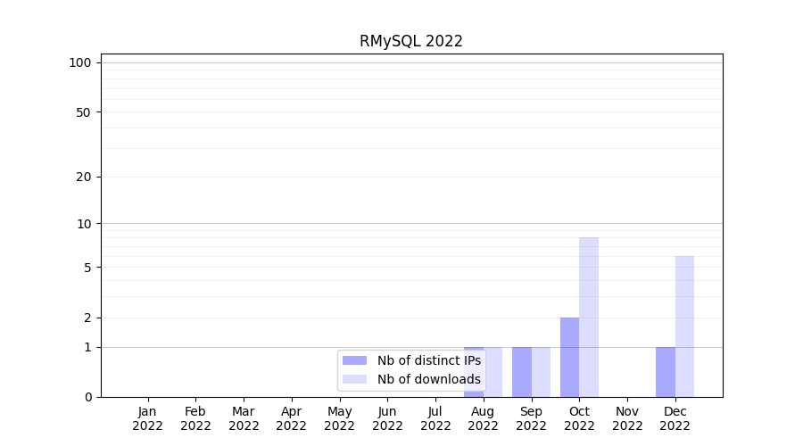 Number of downloads for annotation package RMySQL, year by year, from 2025 back to 2014 (years with no downloads are omitted):