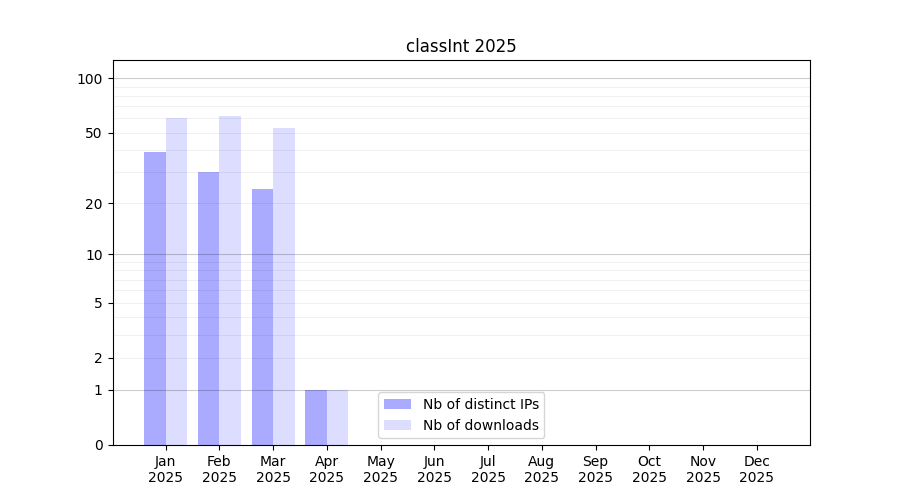 Number of downloads for annotation package classInt, year by year, from 2025 back to 2014 (years with no downloads are omitted):