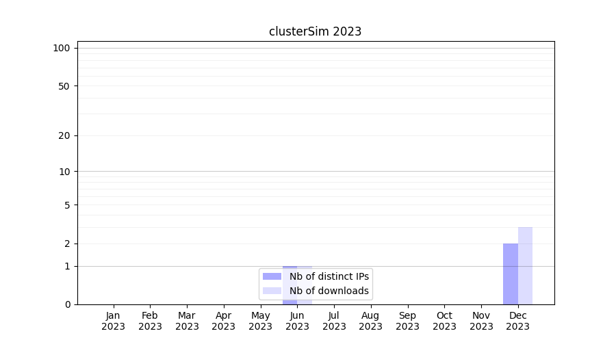 Number of downloads for annotation package clusterSim, year by year, from 2025 back to 2014 (years with no downloads are omitted):