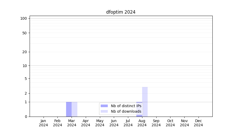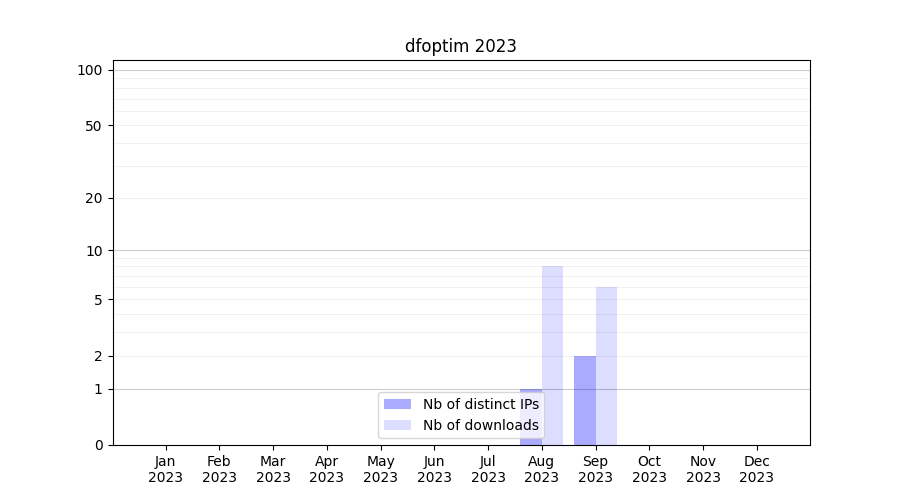 Number of downloads for annotation package dfoptim, year by year, from 2025 back to 2014 (years with no downloads are omitted):