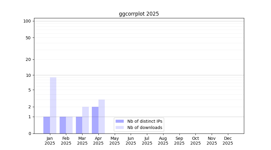 Number of downloads for annotation package ggcorrplot, year by year, from 2025 back to 2014 (years with no downloads are omitted):