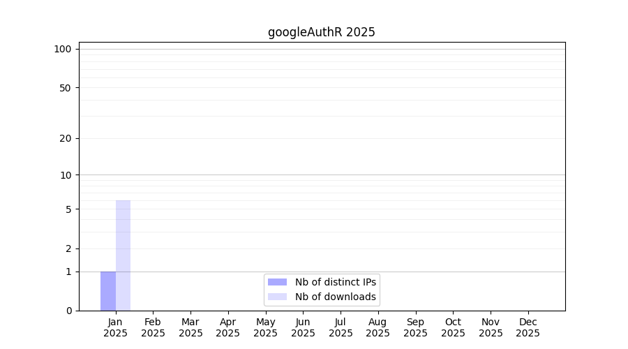 Number of downloads for annotation package googleAuthR, year by year, from 2025 back to 2014 (years with no downloads are omitted):