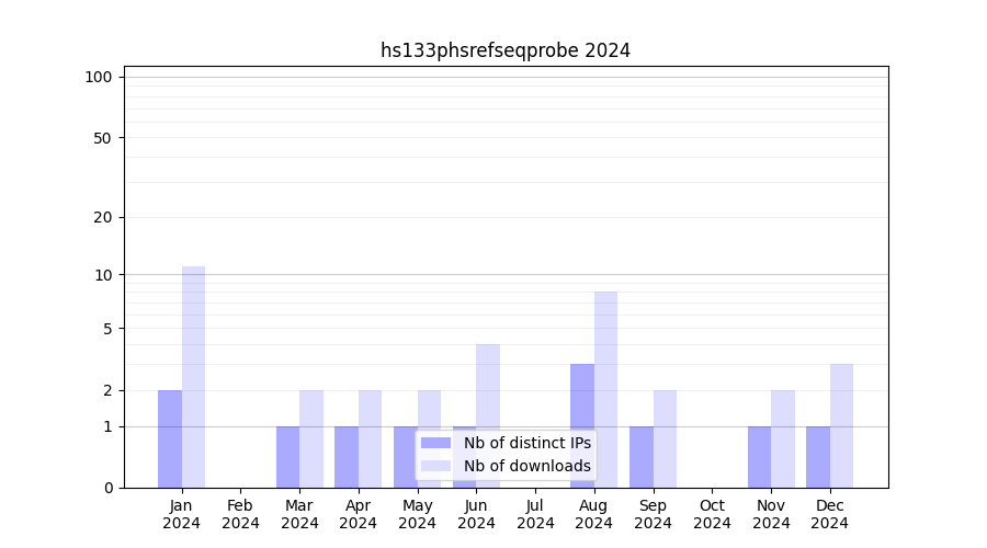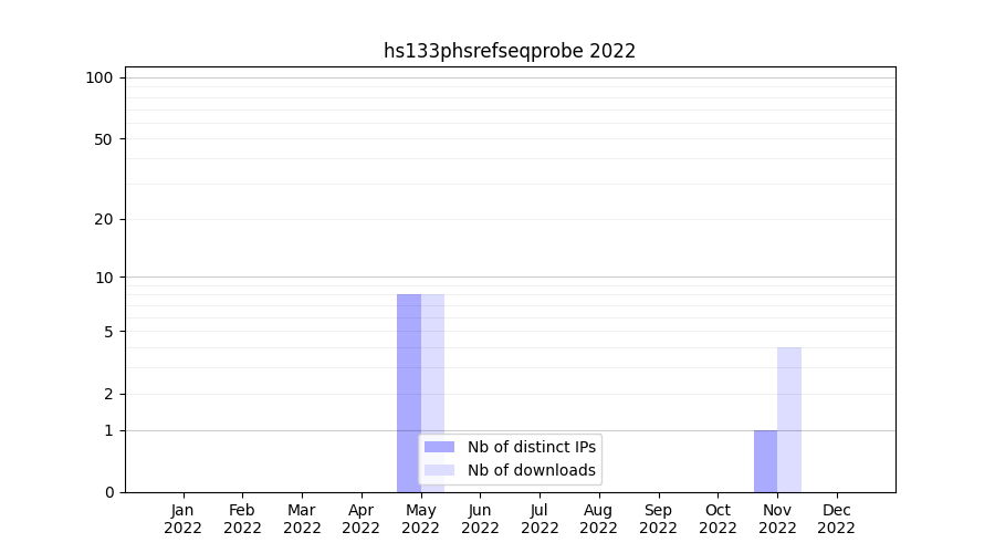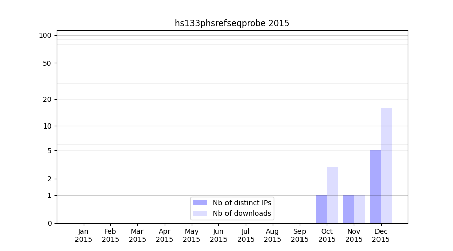 Number of downloads for annotation package hs133phsrefseqprobe, year by year, from 2025 back to 2014 (years with no downloads are omitted):