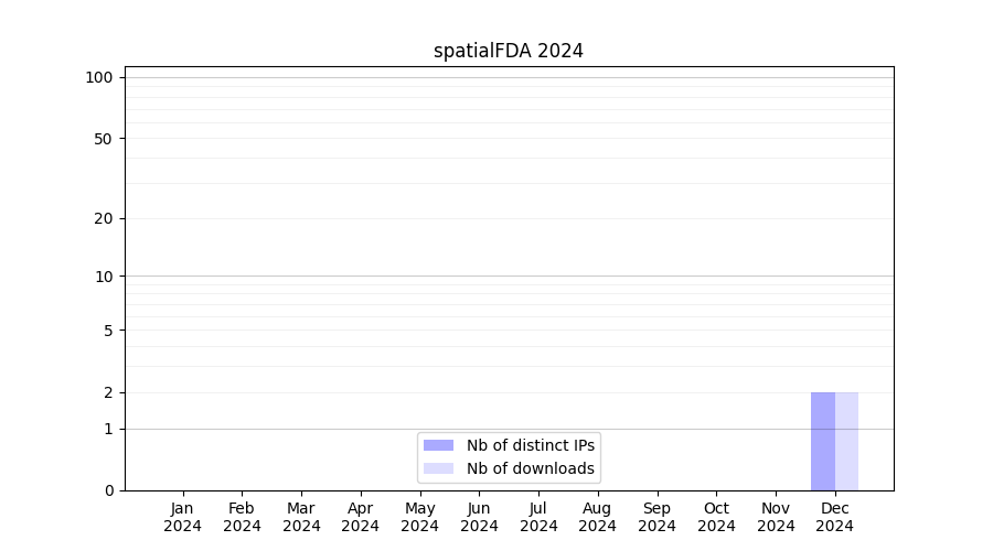 Number of downloads for annotation package spatialFDA, year by year, from 2025 back to 2014 (years with no downloads are omitted):
