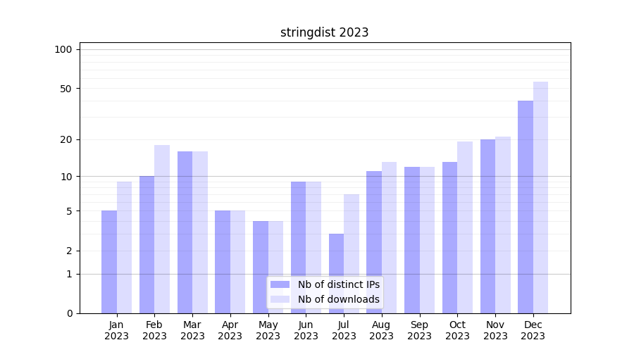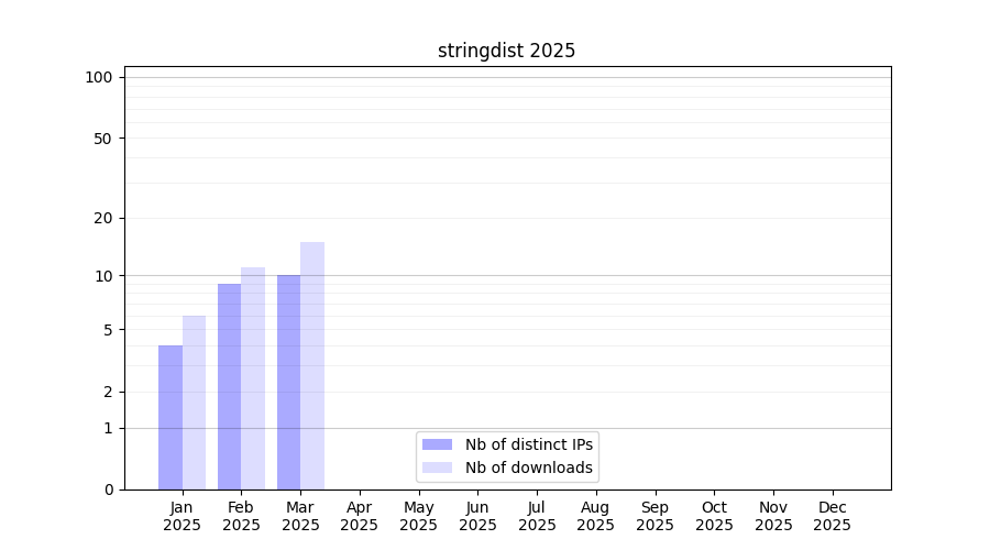Number of downloads for annotation package stringdist, year by year, from 2025 back to 2014 (years with no downloads are omitted):