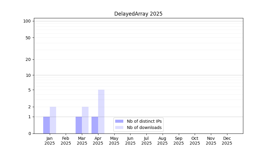 Number of downloads for experiment package DelayedArray, year by year, from 2025 back to 2014 (years with no downloads are omitted):