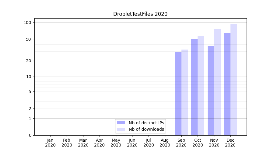 Number of downloads for experiment package DropletTestFiles, year by year, from 2025 back to 2014 (years with no downloads are omitted):