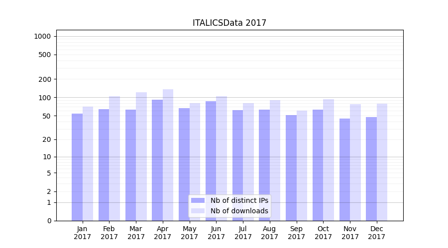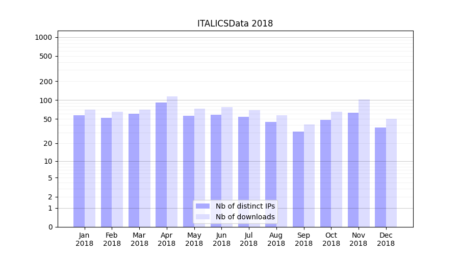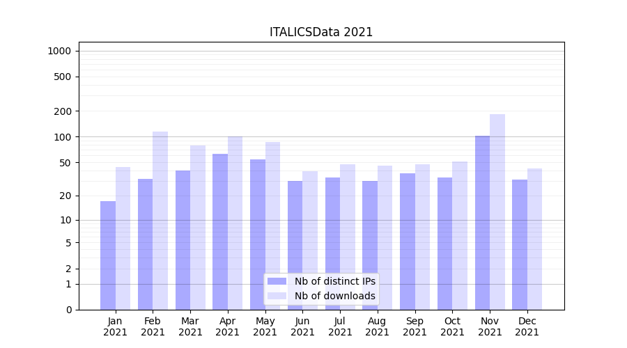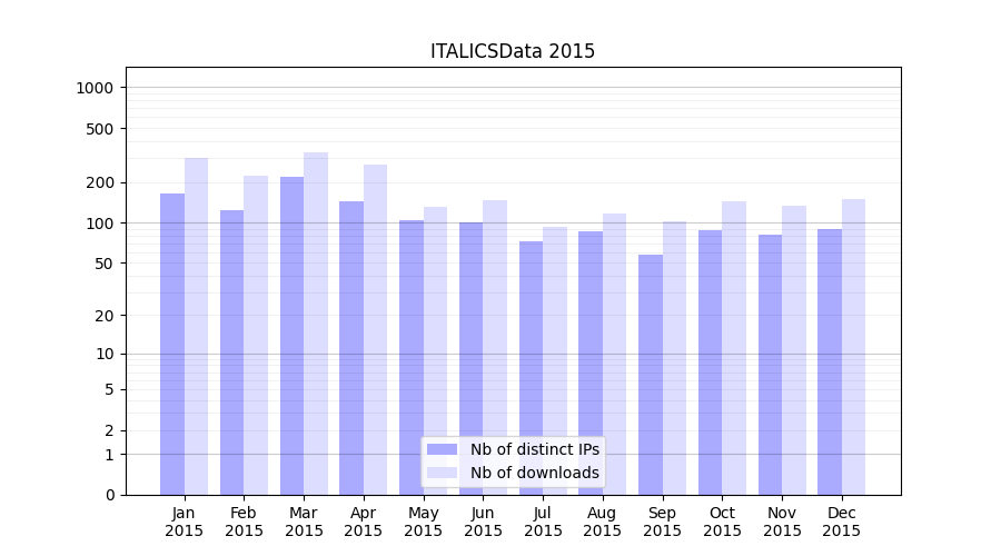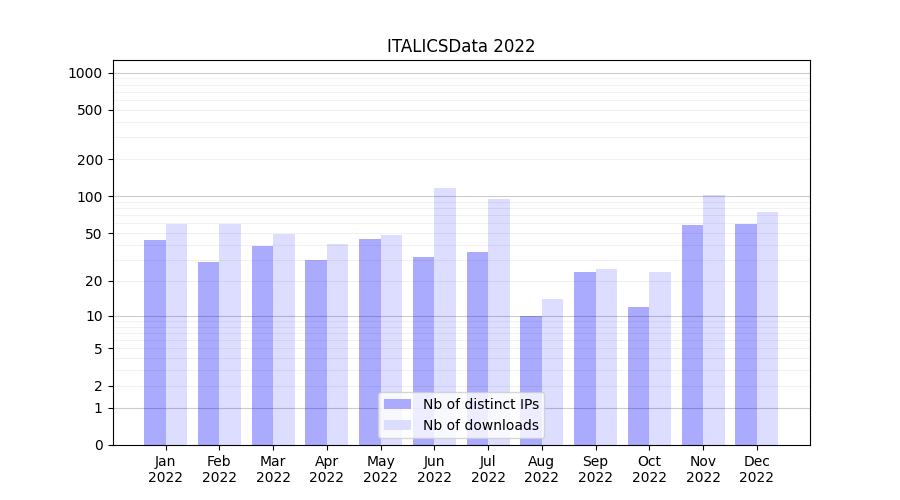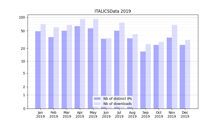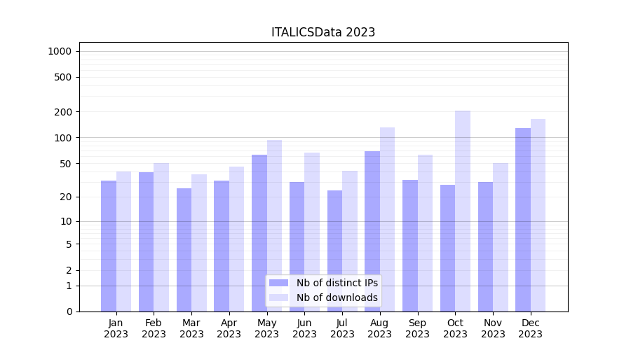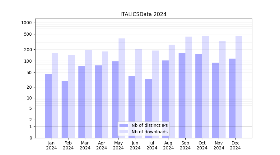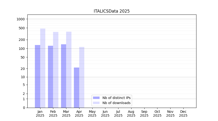 Number of downloads for experiment package ITALICSData, year by year, from 2025 back to 2014 (years with no downloads are omitted):