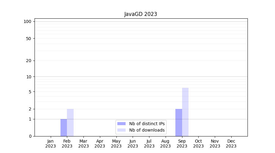 Number of downloads for experiment package JavaGD, year by year, from 2025 back to 2014 (years with no downloads are omitted):