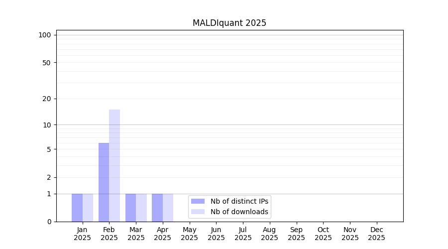 Number of downloads for experiment package MALDIquant, year by year, from 2025 back to 2014 (years with no downloads are omitted):