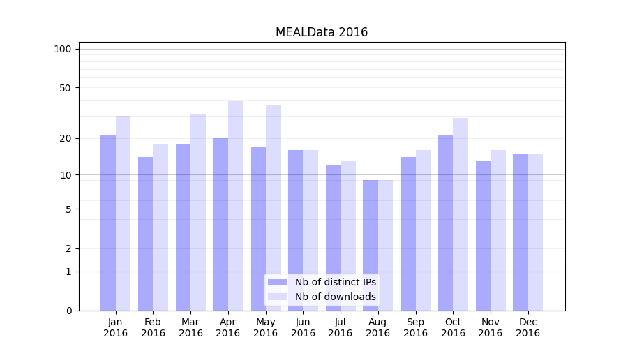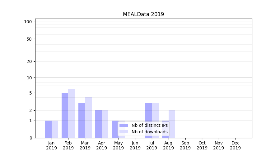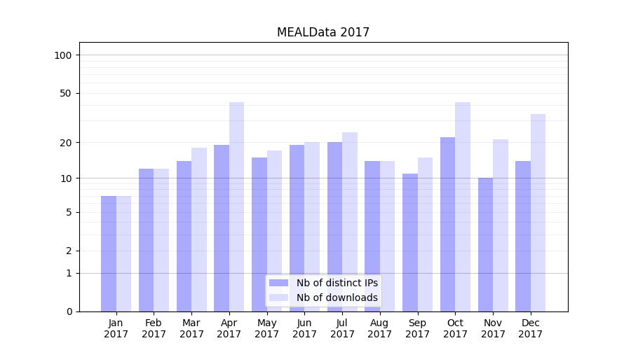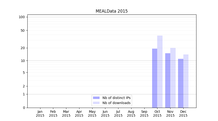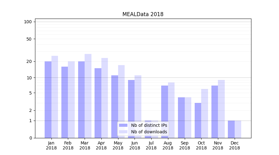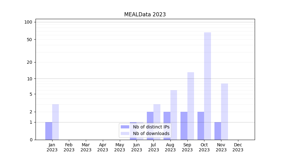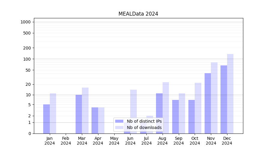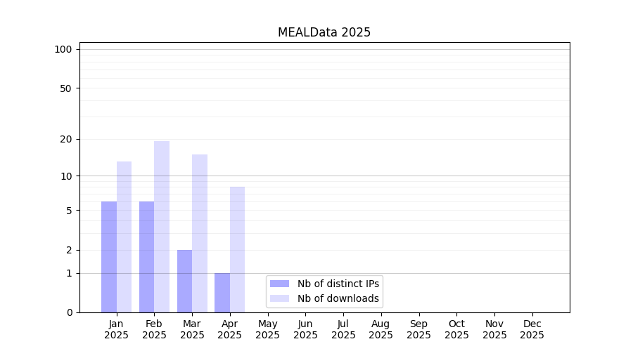 Number of downloads for experiment package MEALData, year by year, from 2025 back to 2014 (years with no downloads are omitted):