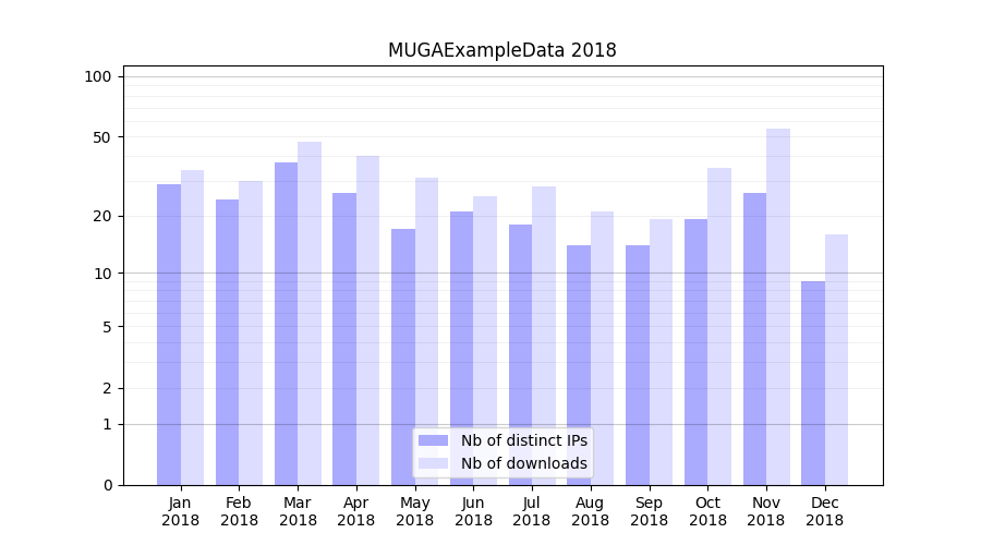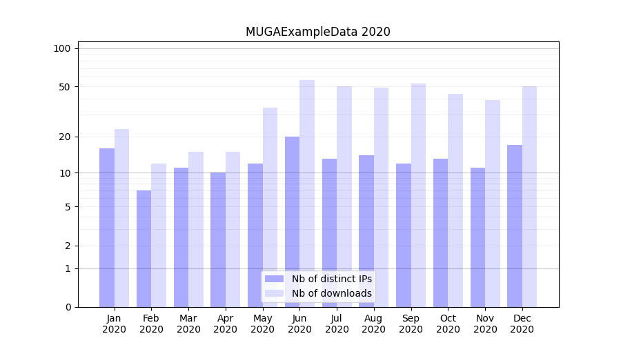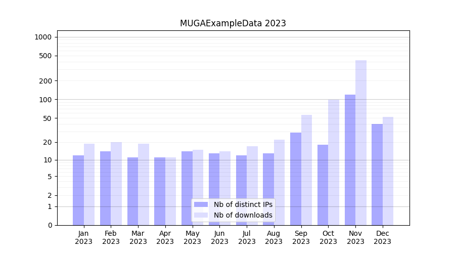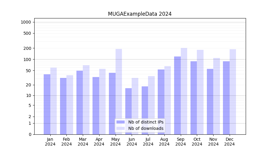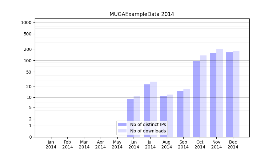 Number of downloads for experiment package MUGAExampleData, year by year, from 2025 back to 2014 (years with no downloads are omitted):