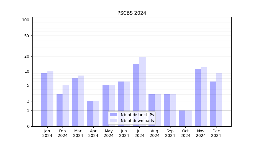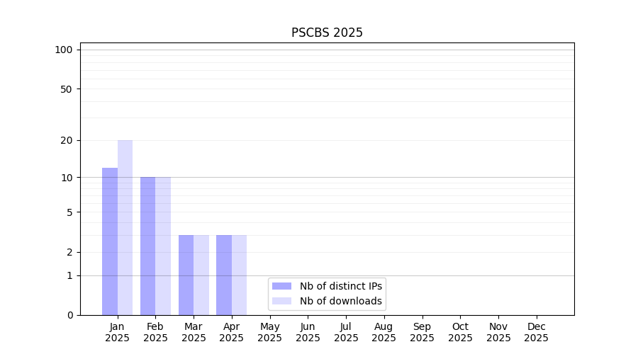 Number of downloads for experiment package PSCBS, year by year, from 2025 back to 2014 (years with no downloads are omitted):