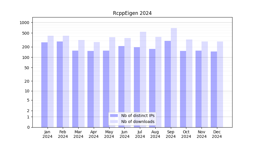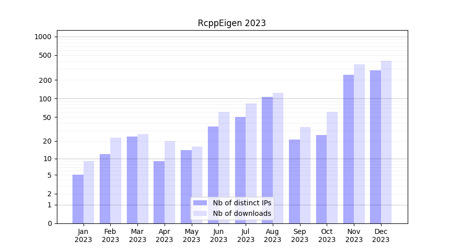 Number of downloads for experiment package RcppEigen, year by year, from 2025 back to 2014 (years with no downloads are omitted):