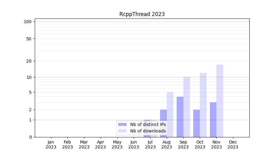 Number of downloads for experiment package RcppThread, year by year, from 2025 back to 2014 (years with no downloads are omitted):