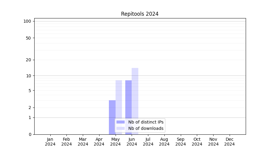 Number of downloads for experiment package Repitools, year by year, from 2025 back to 2014 (years with no downloads are omitted):