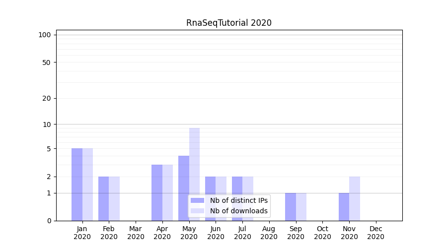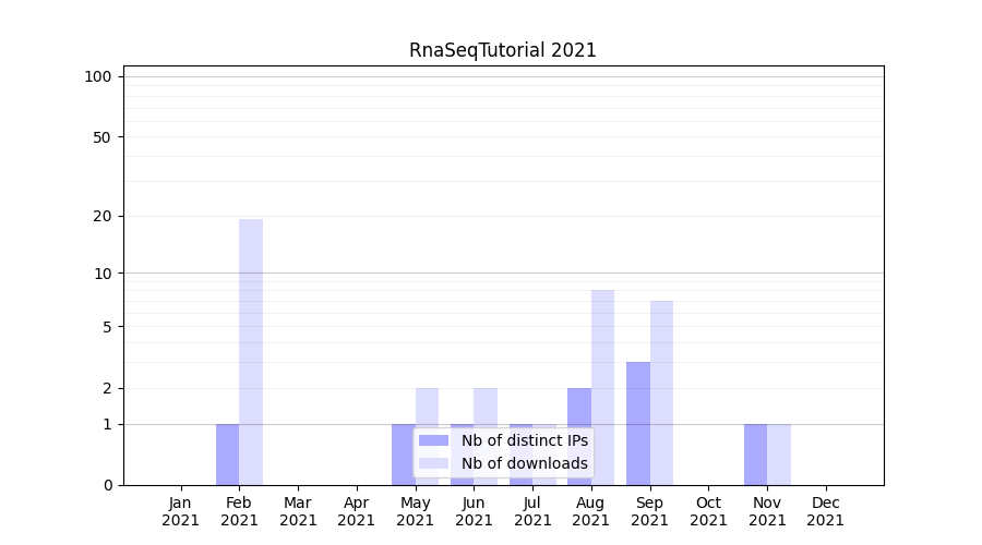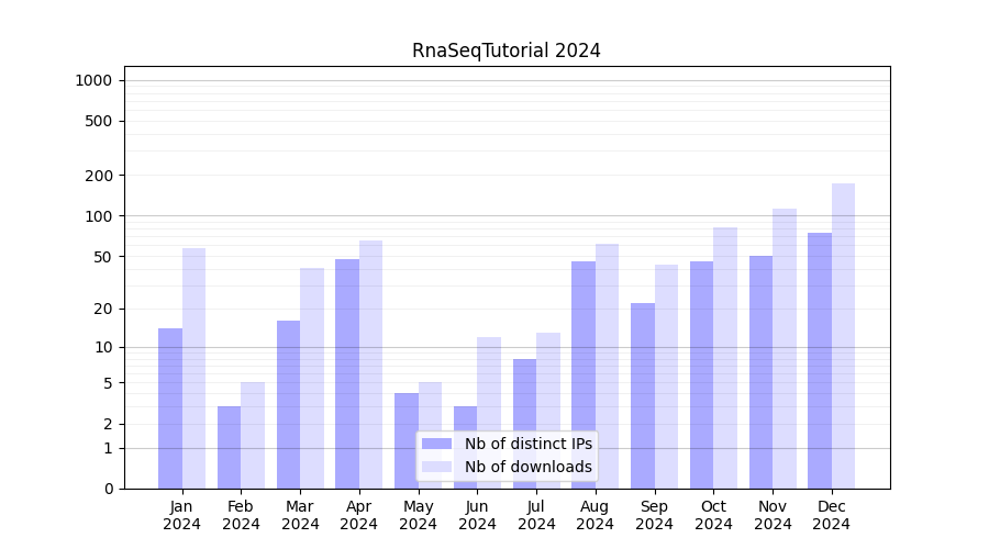 Number of downloads for experiment package RnaSeqTutorial, year by year, from 2025 back to 2014 (years with no downloads are omitted):