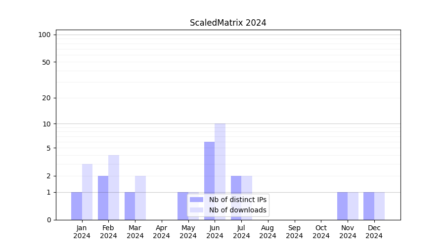 Number of downloads for experiment package ScaledMatrix, year by year, from 2025 back to 2014 (years with no downloads are omitted):