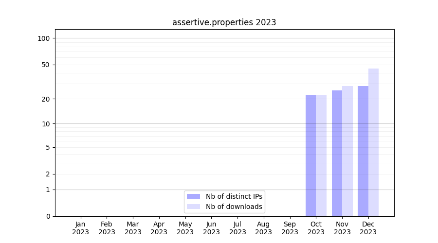 Number of downloads for experiment package assertive.properties, year by year, from 2025 back to 2014 (years with no downloads are omitted):