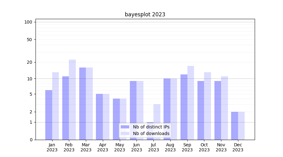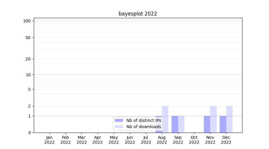 Number of downloads for experiment package bayesplot, year by year, from 2025 back to 2014 (years with no downloads are omitted):