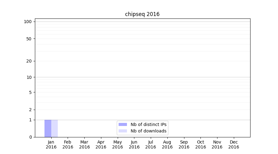 Number of downloads for experiment package chipseq, year by year, from 2025 back to 2014 (years with no downloads are omitted):