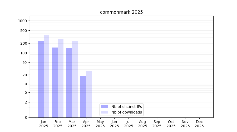 Number of downloads for experiment package commonmark, year by year, from 2025 back to 2014 (years with no downloads are omitted):