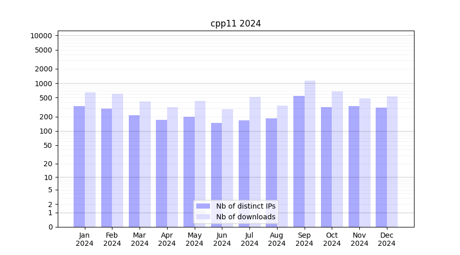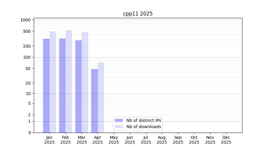 Number of downloads for experiment package cpp11, year by year, from 2025 back to 2014 (years with no downloads are omitted):