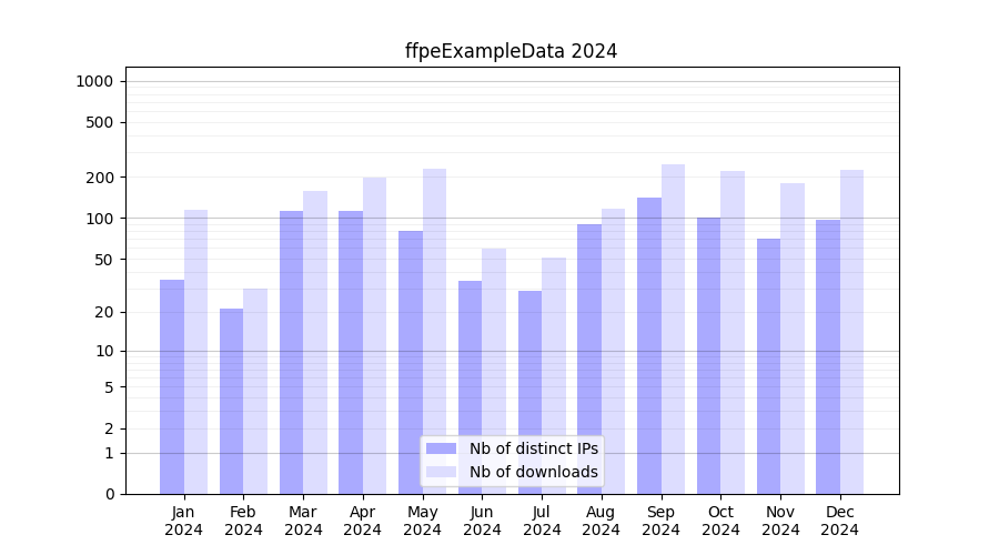 Number of downloads for experiment package ffpeExampleData, year by year, from 2025 back to 2014 (years with no downloads are omitted):