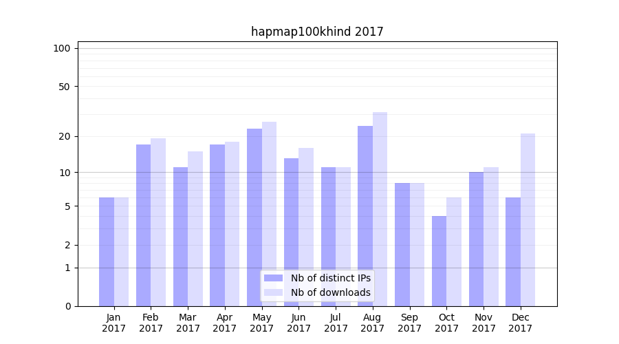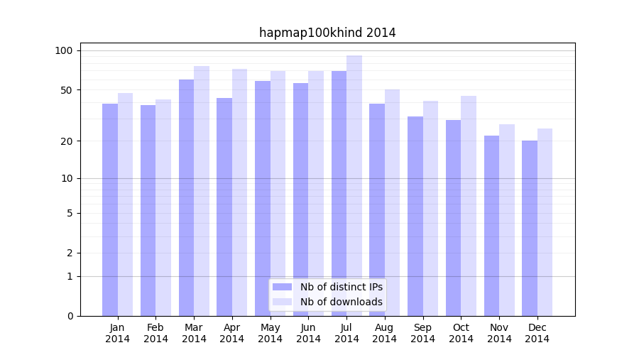 Number of downloads for experiment package hapmap100khind, year by year, from 2025 back to 2014 (years with no downloads are omitted):
