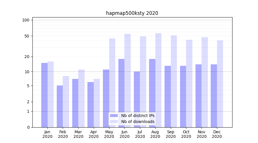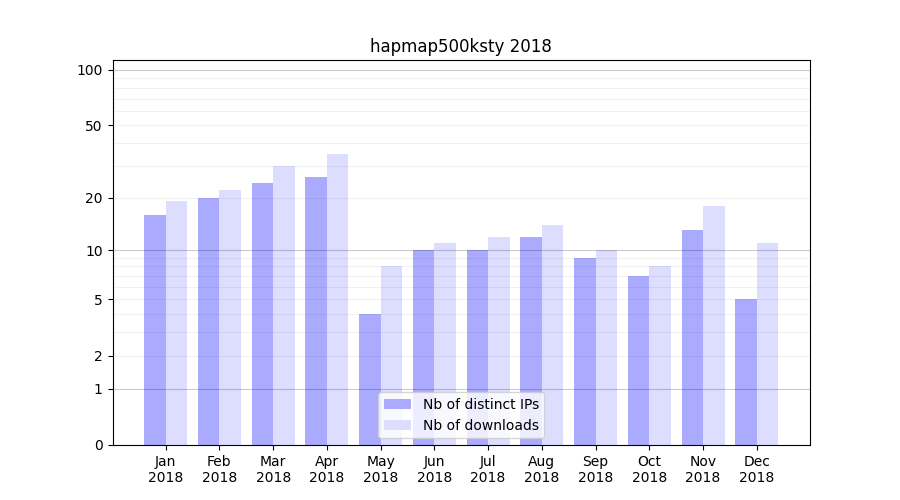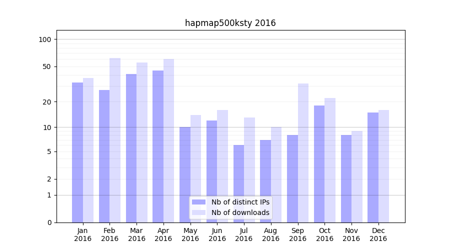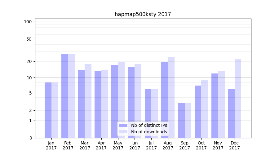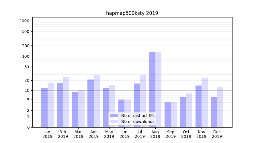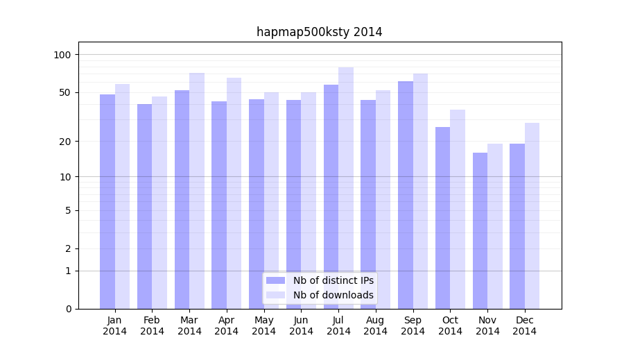 Number of downloads for experiment package hapmap500ksty, year by year, from 2025 back to 2014 (years with no downloads are omitted):