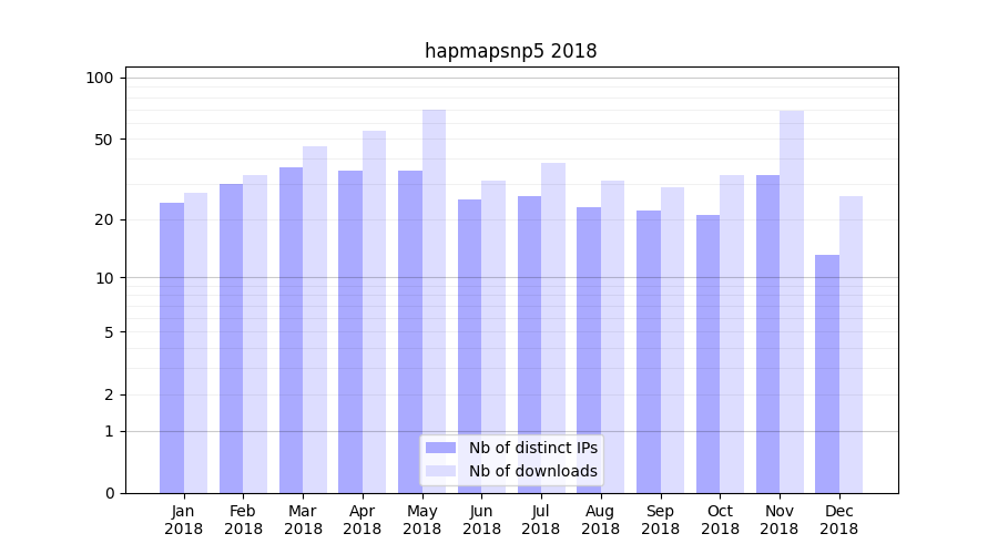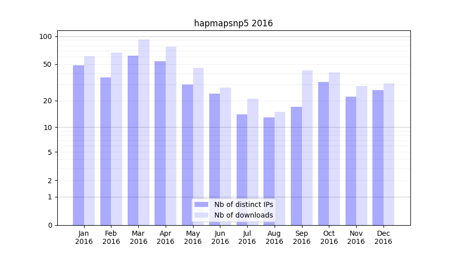 Number of downloads for experiment package hapmapsnp5, year by year, from 2025 back to 2014 (years with no downloads are omitted):
