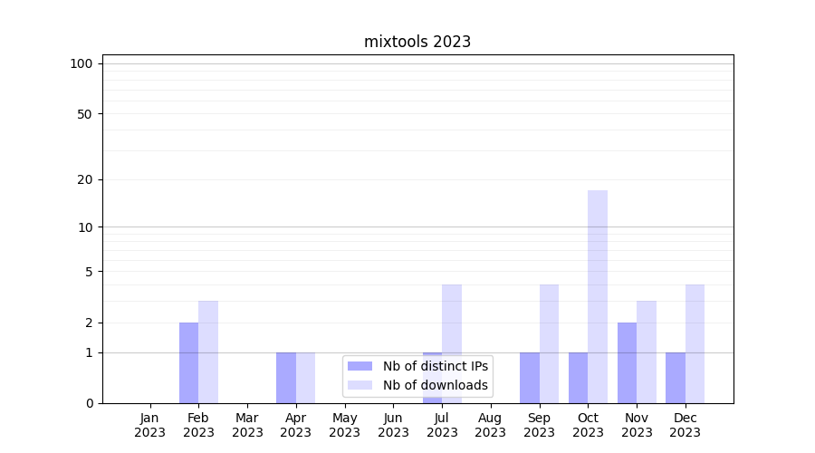 Number of downloads for experiment package mixtools, year by year, from 2025 back to 2014 (years with no downloads are omitted):