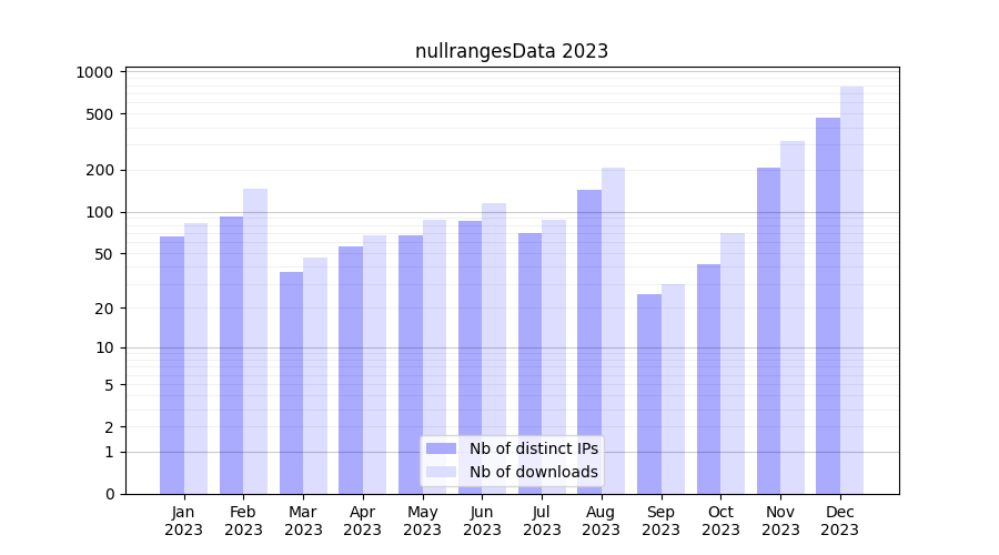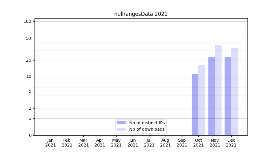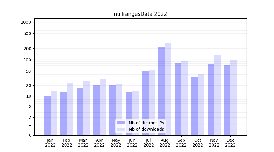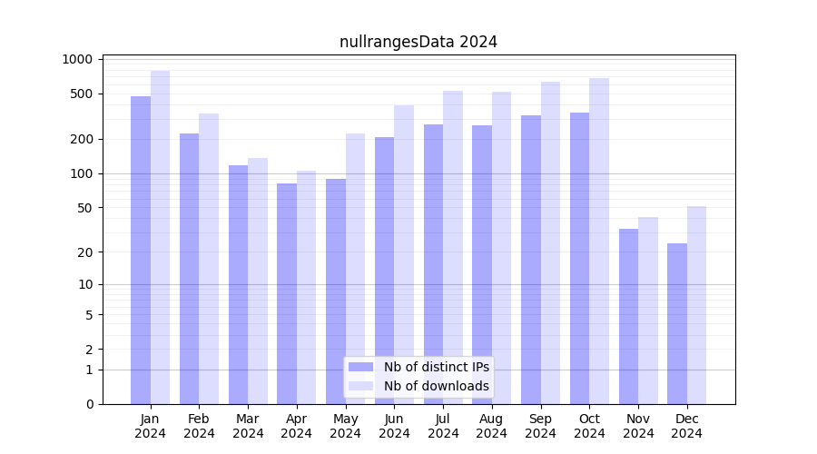 Number of downloads for experiment package nullrangesData, year by year, from 2025 back to 2014 (years with no downloads are omitted):