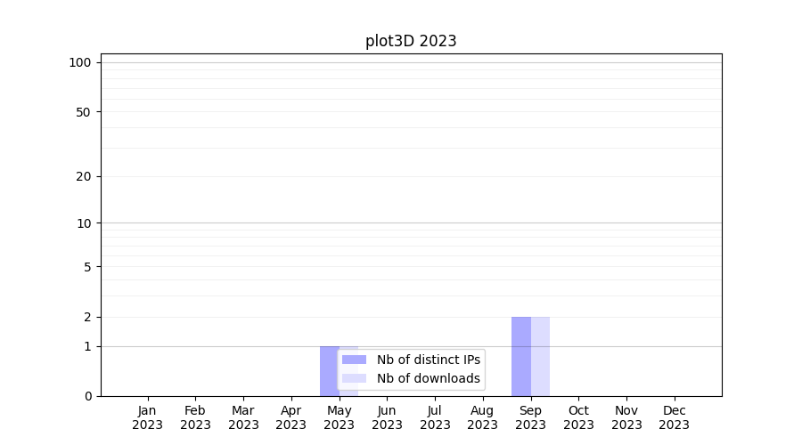 Number of downloads for experiment package plot3D, year by year, from 2025 back to 2014 (years with no downloads are omitted):