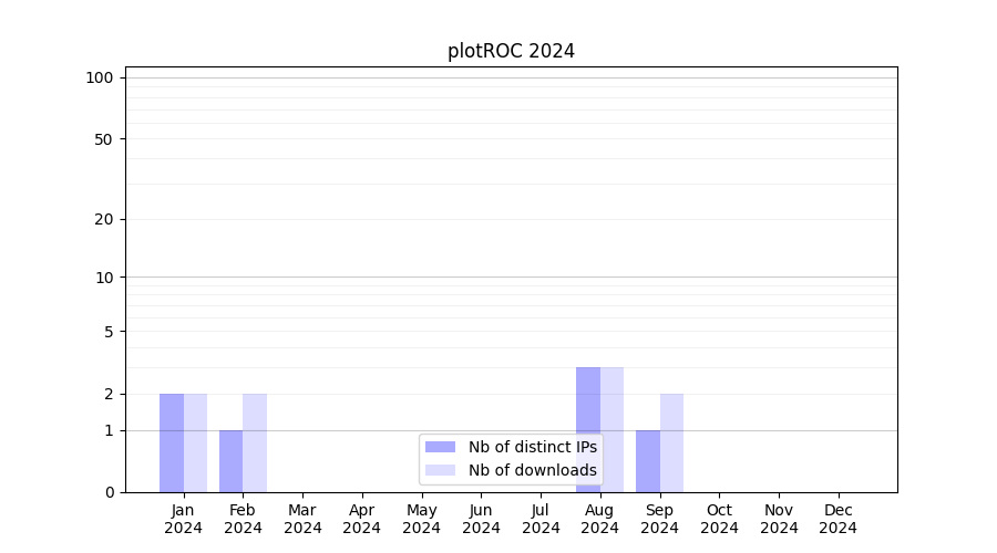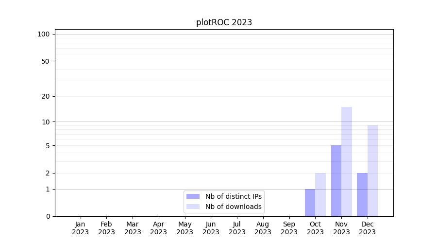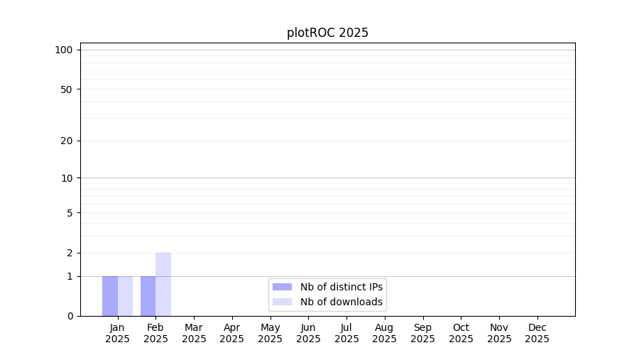 Number of downloads for experiment package plotROC, year by year, from 2025 back to 2014 (years with no downloads are omitted):