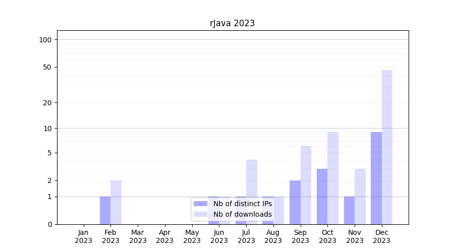 Number of downloads for experiment package rJava, year by year, from 2025 back to 2014 (years with no downloads are omitted):